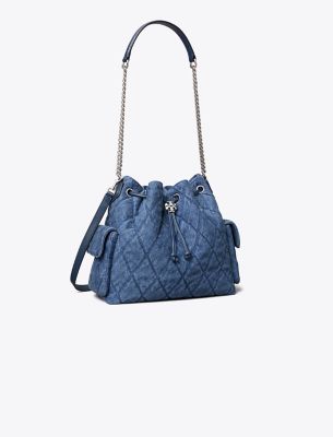 A modern classic, Charlie evolves with our Quilted Drawstring Shoulder Bag. Soft structure balances tailored edges and sleek beveled hardware. Crafted in denim with tonal diamond stitching, it is designed with exterior and interior pockets for organization. Wear with the chain shoulder strap or go hands-free with the removable leather crossbody strap.